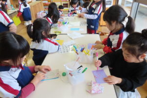 絵や字で思い思いに願い事を絵馬に描いています😊